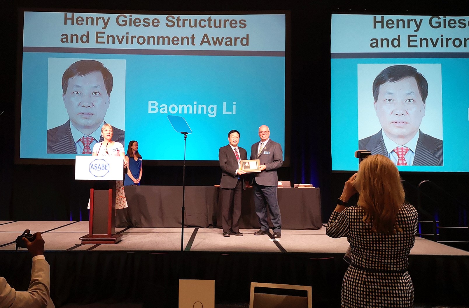 7月7日-10日,2019年美国农业与生物工程师学会(ASABE)国际学术年会在美国波士顿举行。在7月10日的颁奖典礼上,中国农业工程学会畜牧工程分会理事长、中国农业大学李保明教授荣获2019年度ASABE亨利‧吉斯建筑与环境奖(Henry Giese Structures & Environment Award),ASABE主席Maury Salz为李保明教授颁奖。