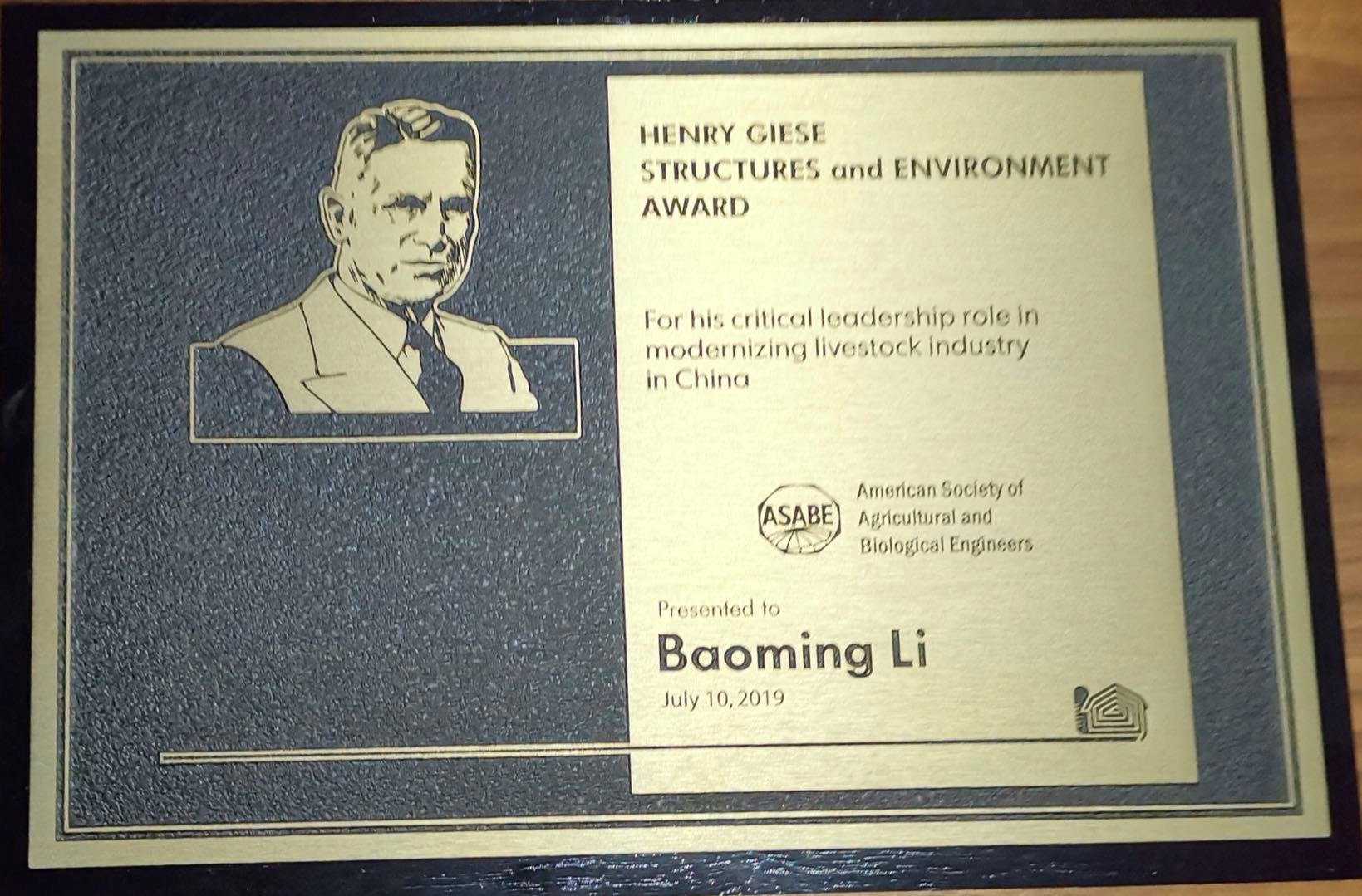 亨利‧吉斯建筑与环境奖设立于1959年,1988年由Henry Giese家族冠名,以纪念Henry Giese在农业建筑设计、研究和教学方面的终身成就。该奖项由专家提名并经评奖委员会评审,每年在全球范围内遴选1名获奖者,以表彰获奖者在推进农业建筑与环境领域知识和科技进步所作出的杰出贡献(For distinguished service in advancing the knowledge and science of agricultural structures and environment)。李保明教授成为该奖项设立60年来,亚洲范围内的首位获奖者。为表彰李保明教授在推进中国设施农业现代化,特别是在畜禽舍建筑设计和环境控制领域取得的突出成就,以及在该领域促进全球学术交流与合作方面的突出贡献,ASABE授予其2019年亨利‧吉斯建筑与环境奖。